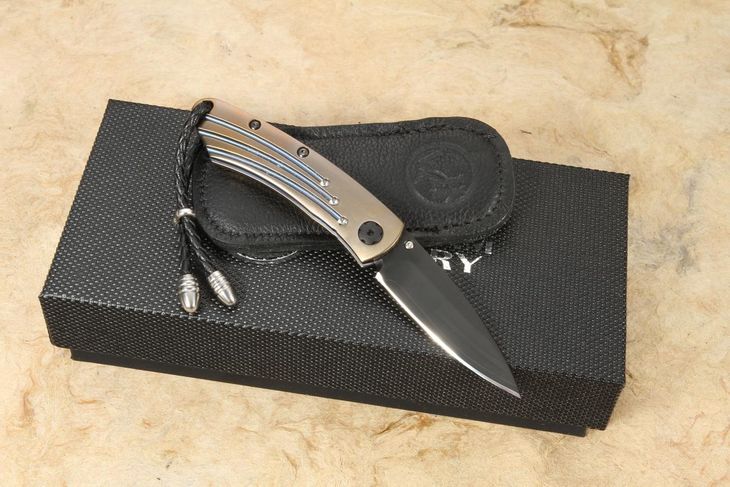 The William Henry Scorch handle is made from aerospace grade titanium with a gold anodized finish to ensure its light weight and strength, and features fittings and specially machined groves that are anodized in an electric blue. At 2.63 inches long closed, the knife fits comfortably in your hand, without being too small to slip out of grasp. The knife opens with the smokey quartz jewel inlaid thumb stud. The handle is also fitted with a lanyard hole and a black leather braided lanyard. This knife comes with a black leather clip case that provides the user multiple carry options while protecting the handle finish.