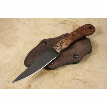 Winkler's creations are complemented by the unique leather work of Karen Shook, who, with Winkler, crafts each item in its entirety. The gorgeous leather sheaths she creates for many Winkler knives and axes fit each piece of cutlery snugly while allowing for quickdraws. They are lined with Kydex to protect against moisture without sacrificing comfort or stealth. Specifications can usually be adapted from one design to another depending on individual preference.