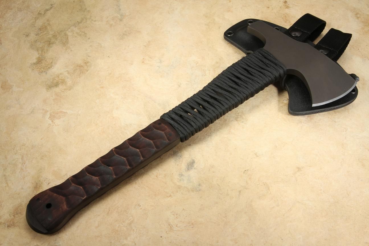 The Hammer Combat Axe is crafted from a single piece of steel, creating an integral, highly durable tool for heavy use The Hammer Combat Axe is coated with a black Caswell finish, offering reduced glare and exceptional rust prevention. The sculpted maple and black paracord wrap handle allow for excellent grip and control, even in rain, snow, or mud, making the Winkler Axe ideal for survival and outdoor uses in which natural elements are an issue. The Winkler Combat Axe comes equipped with a custom felt-lined black Kydex sheath, adding an extra layer of protection to the axe and allowing for easy carry in multiple positions. With an overall weight of 1 pound 11.1 ounces, the Winkler Combat Axe in sculpted maple and black cord wrap provides the heft needed for military breaching or outdoor survival tasks, making it the perfect axe for any military, combat, or survival arsenal.