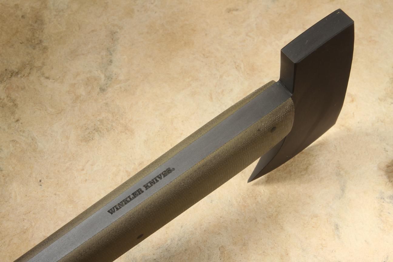 As far as hatchets go, the Winkler Knives Highland Hatchet is a force to be reckoned with. The hatchet head is made from impact-resistant 80CrV2 steel with a Rockwell hardness of 57-60, allowing it to be tough, but also retain a sharp edge for a long time. At nearly 2.3" long, the black oxide Caswell finished head is made from 3/8" stock, and the tapered tang extends through the full length of the handle for extra strength.