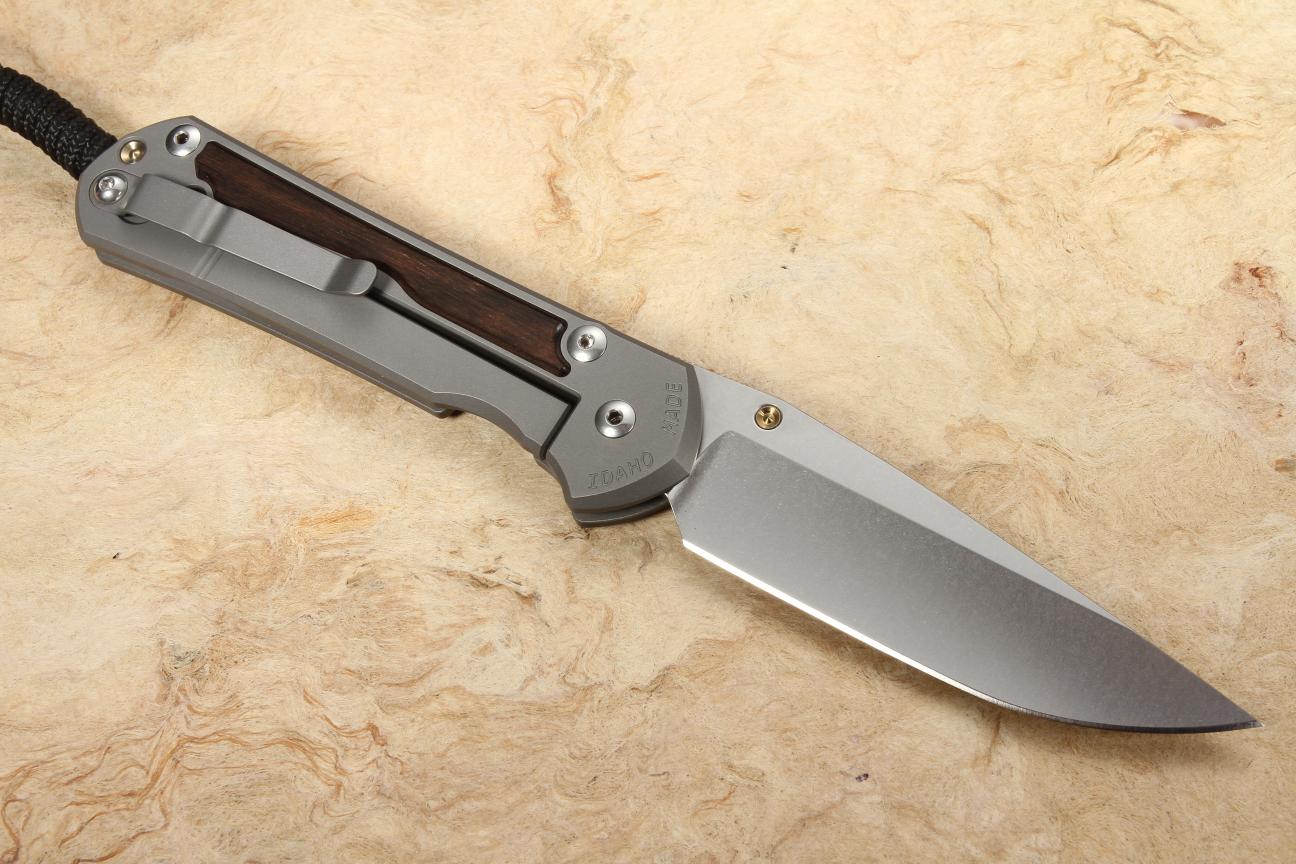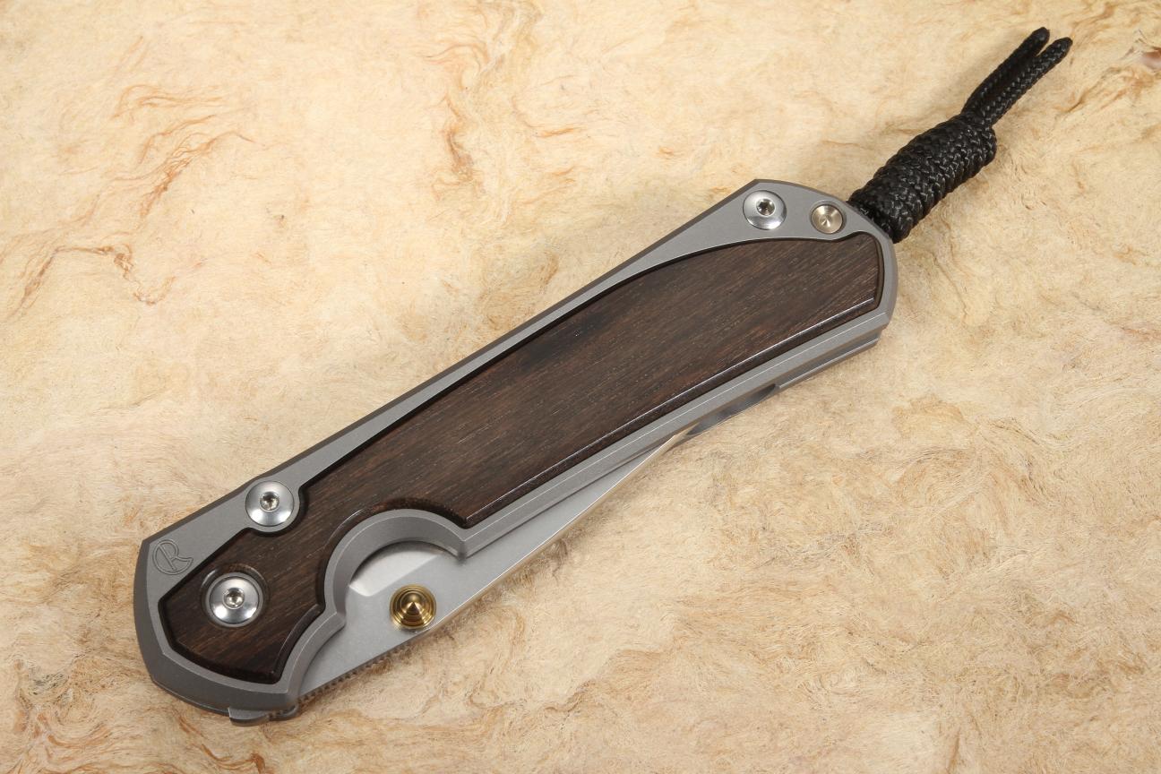 This is an upscale wood inlay build of the timeless Sebenza 31 folding knife. It features a drop point blade, matte blasted titanium handle, and macassar ebony inlays. The highly figured color of the Macassar Ebony will be a stunning addition to your EDC or collection.