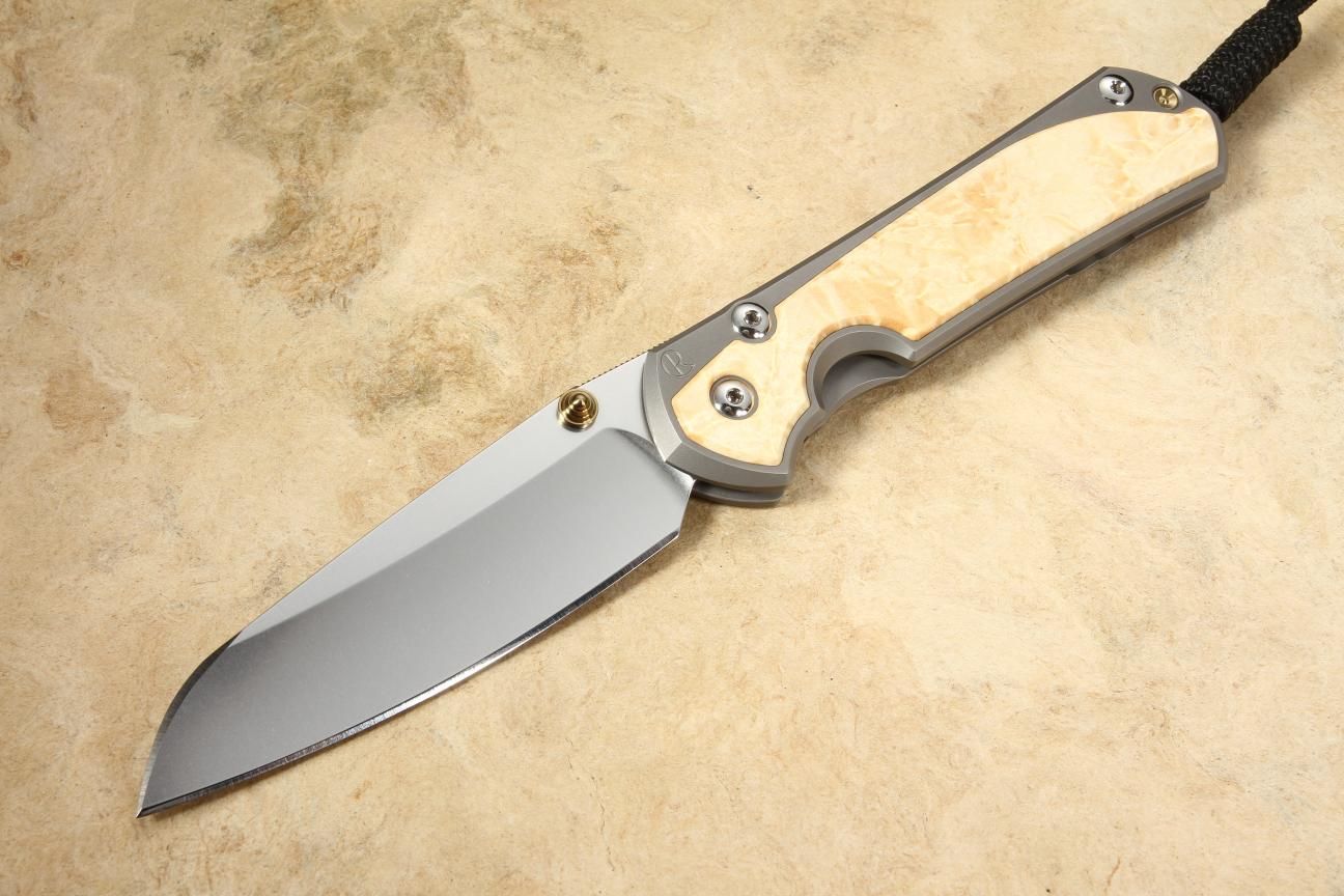 This is an upscale wood inlay build of the timeless Sebenza 31 folding knife. It features an insingo blade, a lightly blasted titanium handle, and polished box elder burl inlays. The highly figured burl and the light brown color of the Box Elder will be a stunning addition to your EDC or collection.