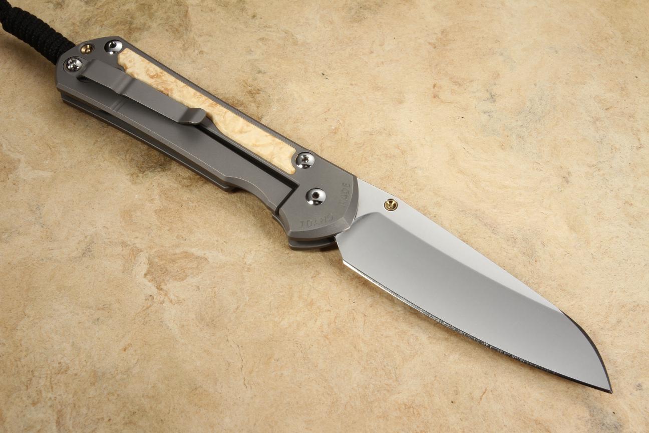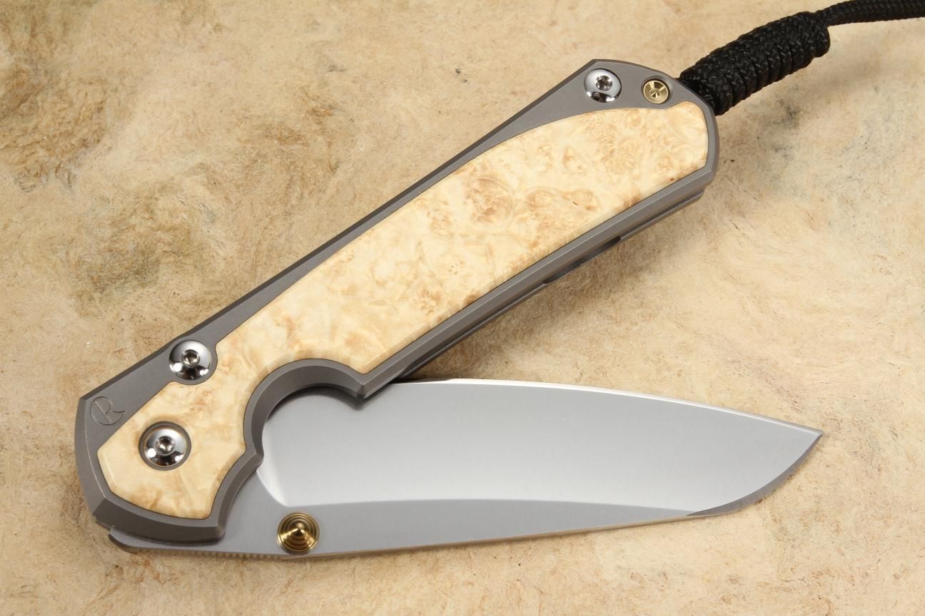 This is an upscale wood inlay build of the timeless Sebenza 31 folding knife. It features an insingo blade, a lightly blasted titanium handle, and polished box elder burl inlays. The highly figured burl and the light brown color of the Box Elder will be a stunning addition to your EDC or collection.