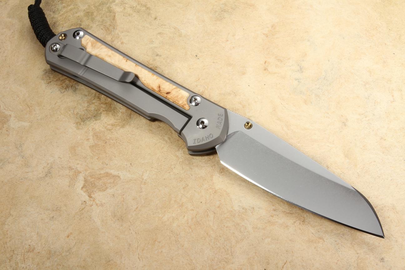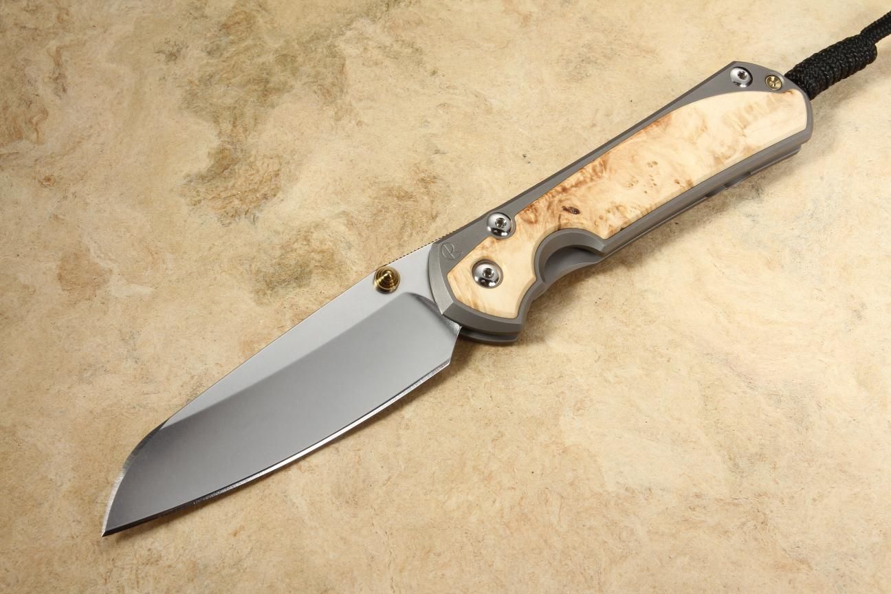 This is an upscale wood inlay build of the timeless Sebenza 31 folding knife. It features an insingo blade, a lightly blasted titanium handle, and polished box elder burl inlays. The highly figured burl and the light brown color of the Box Elder will be a stunning addition to your EDC or collection.