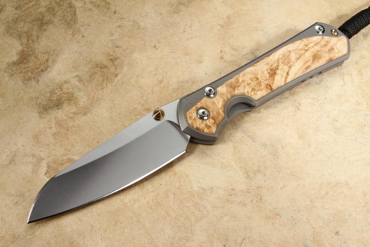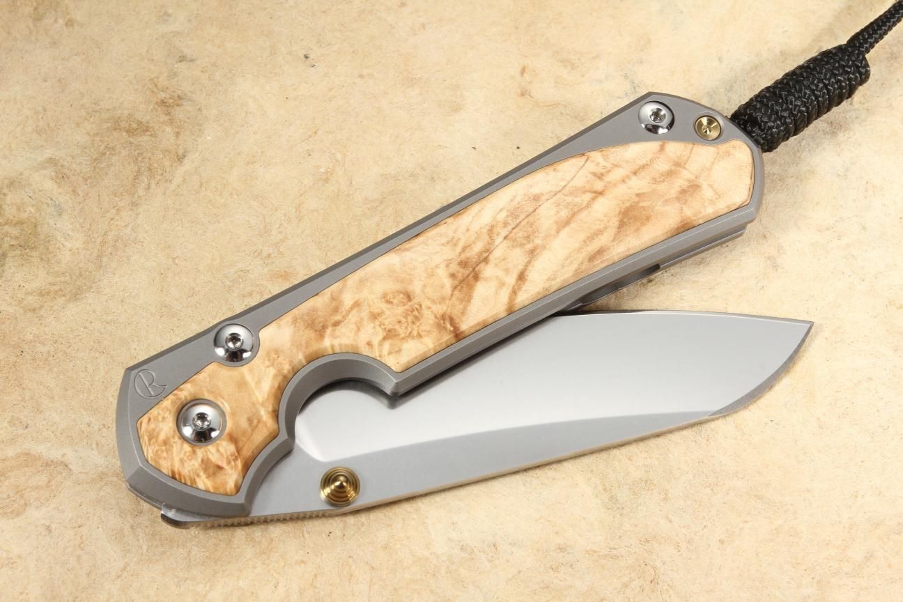 This is an upscale wood inlay build of the timeless Sebenza 31 folding knife. It features an insingo blade, a lightly blasted titanium handle, and polished box elder burl inlays. The highly figured burl and the light brown color of the Box Elder will be a stunning addition to your EDC or collection.