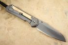 The Chris Reeve Large Sebenza 31 is 8.335" in overall length with a 3.625" blade made of CPM Magnacut stainless steel, which was made by Crucible Industries. It uses vanadium and niobium to create extremely tough and hard tool steel. The insingo blade is finely stonewashed and hollow ground for the best slicing profile. With a Rockwell hardness of 63-64, it is extremely hard and holds a razor-sharp edge, and endures all sorts of punishment cut after cut. The knife has a bronze anodized titanium thumb stud for opening with your right hand.