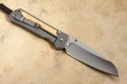 The Chris Reeve Large Sebenza 31 is 8.335" in overall length with a 3.625" blade made of CPM Magnacut stainless steel, which was made by Crucible Industries. It uses vanadium and niobium to create extremely tough and hard tool steel. The insingo blade is finely stonewashed and hollow ground for the best slicing profile. With a Rockwell hardness of 63-64, it is extremely hard and holds a razor-sharp edge, and endures all sorts of punishment cut after cut. The knife has a bronze anodized titanium thumb stud for opening with your right hand.