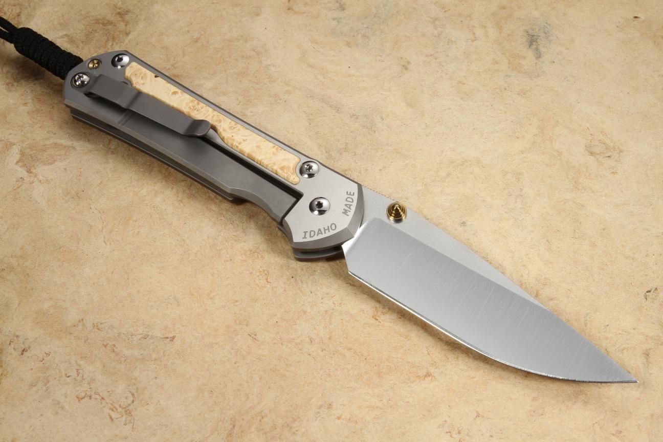 This is an upscale wood inlay build of the timeless Sebenza 31 folding knife. It features a drop point blade, glass-blasted titanium handle with polished flats, and polished box elder burl inlays. The highly figured burl and the light brown color of the Box Elder will be a stunning addition to your EDC or collection.