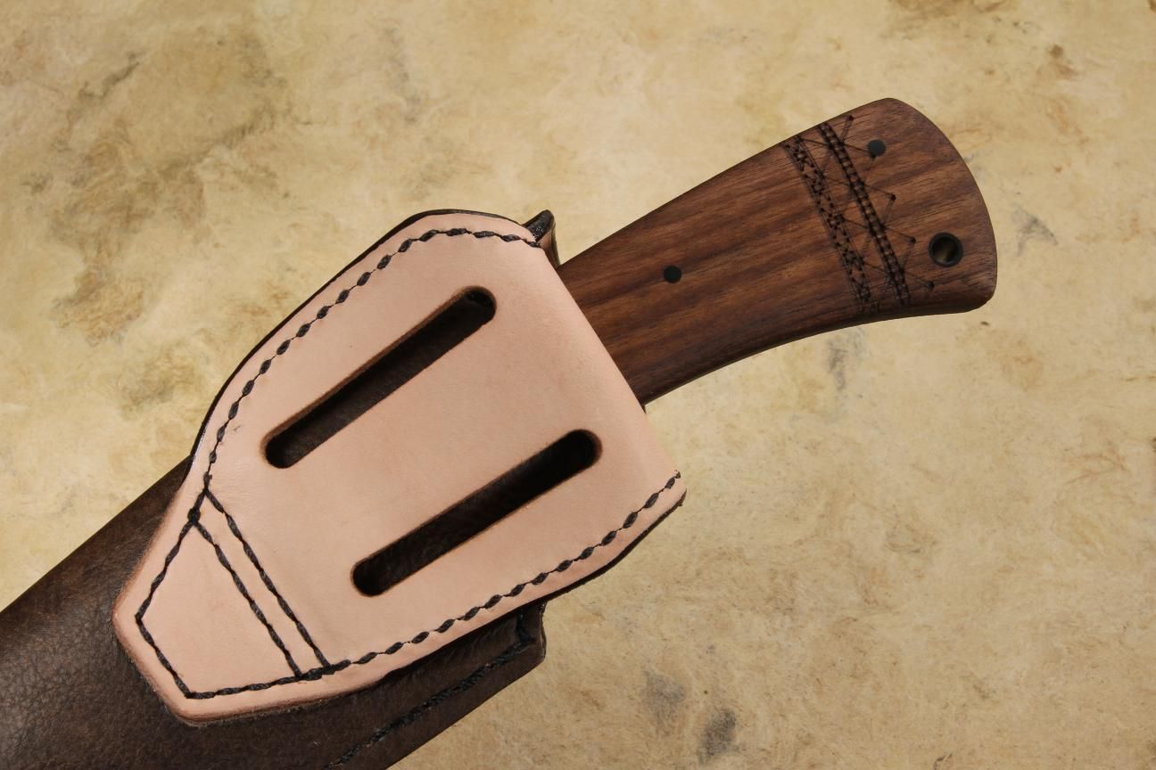 The handle is made of premium walnut with a tribal pattern. There is even a lanyard hole to help with a firm and secure grip for those times when the weather or the cutting job requires. This knife rests in a top-quality formed DeSantis leather sheath. Carry it in your pack or on your belt for the ultimate heavy use camp knife.