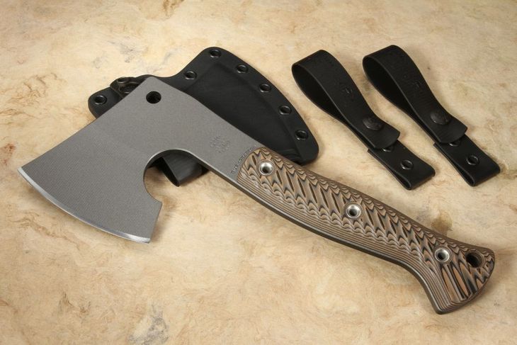 Made from 52100 tool steel (the same steel used in industrial ball bearings), the Rockwell hardness of 57-58 walks that line of providing durable, tough steel, without making it too brittle to keep a long-lasting edge. The cutting surface of the RMJ Bushcrafter is a chisel ground 3.75" edge that allows for the full weight of the 1lb 5 oz. axe to be focused into a capable, concrete splitting outdoor companion. Equally at home dressing an elk as it would be hammering in tent stakes, the Bushcrafter features full-tang handle construction with G10 scales that will help ensure a firm grip swing after swing. The G10 is 3D patterned and comes in Black, Dirty Olive, Explore More and Hyena Brown. A lanyard hole at the end of the haft gives you additional carry options with the help of paracord and the molded kydex scabbard lets you carry the Bushcrafter with confidence on your pack, your tactical webbing, or on your hip with the low ride belt attachment