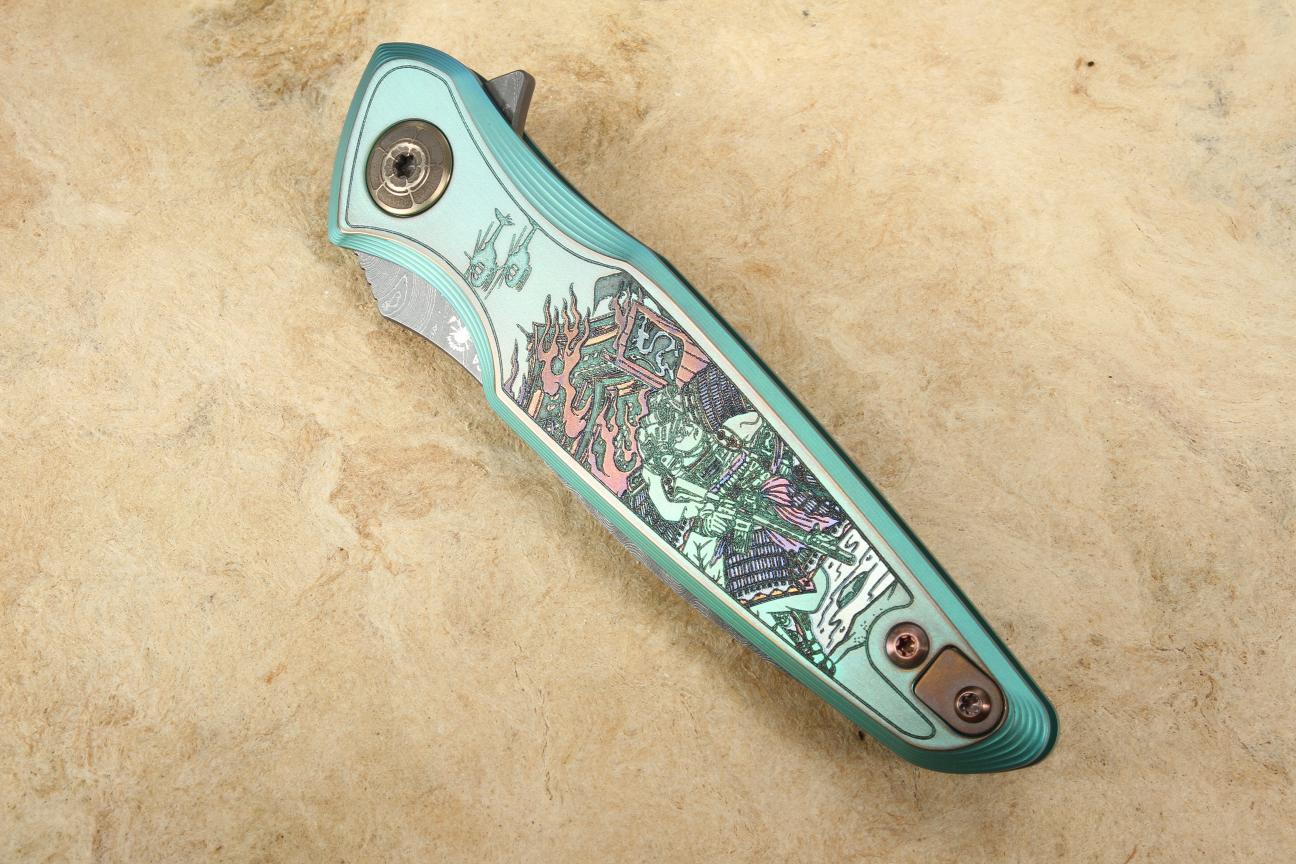 Larry Connelley of KnifeArt.com: "This has all of the smooth flipper action of the standard Pandia with a limited edition handle and a stainless damascus blade. The laser and anodized handle really kicks this knife up several levels. The anodized pattern looks better in hand when you move the handle in the light."