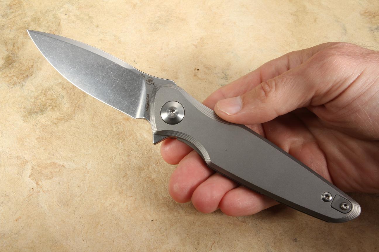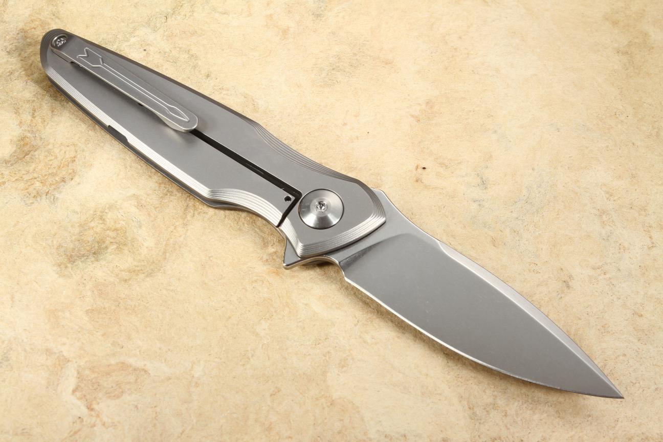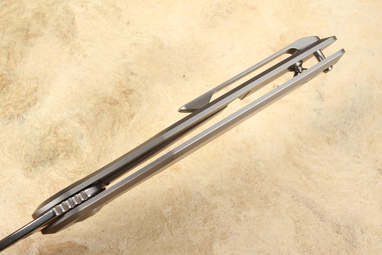Larry Connelley of KnifeArt.com: "It has an extremely sleek in-hand feel with a smooth blasted titanium finish. The blade deployment is quick and precise thanks to the bearing system. Curtis Iovito did a terrific job building an EDC flipper that can really cut thanks to its wide, flat ground blade of CPM MagnaCut."