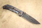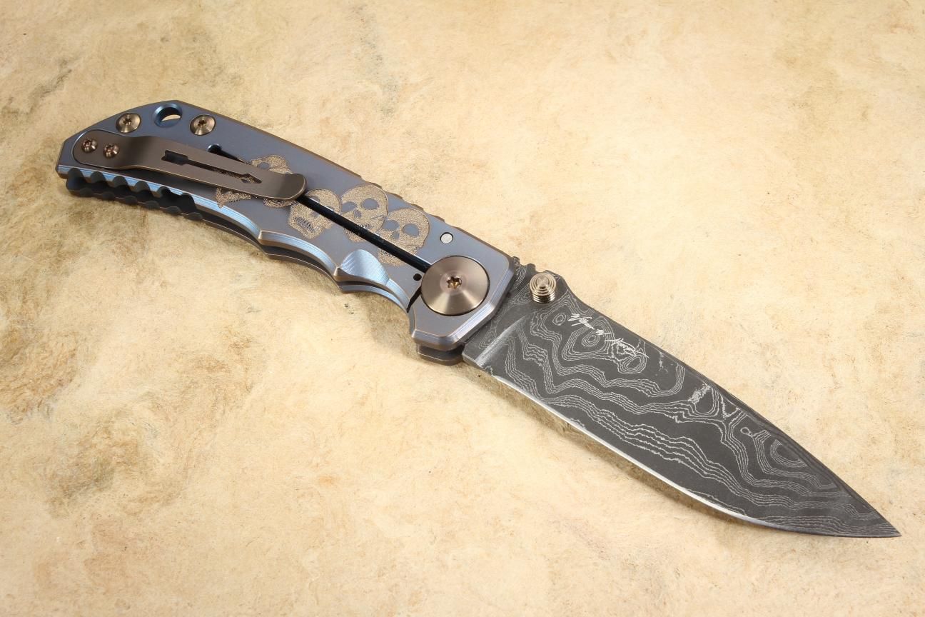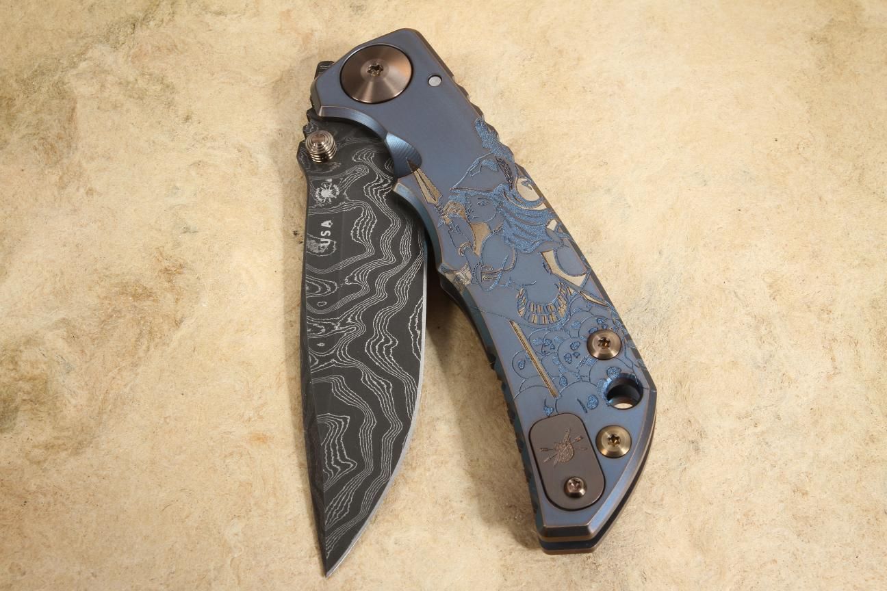 The knife has a 9" overall length with a 4.25" blade. This Chad Nichols stainless damascus blade is stunning. Dual anodized titanium thumb lugs on the blade allow for ambidextrous use, finger grooves providing extra support for precision cuts and power. The handle also features bronze anodized titanium screws, pivot, barrel spacers, and a pocket clip. The knife utilizes a phosphor bronze bushing for reduced friction yet is solid-state and is extremely dependable.