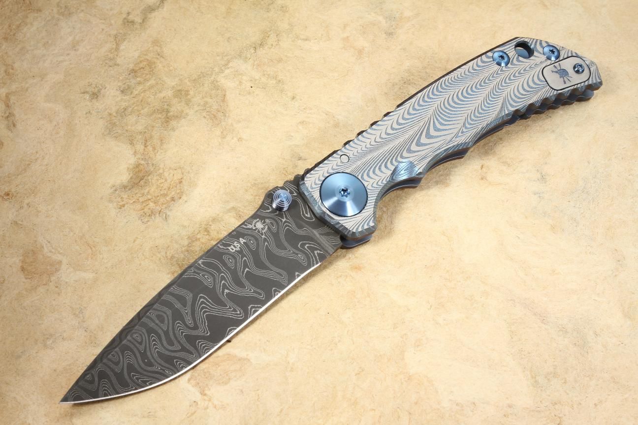 The Spartan Blades framelock has a 9" overall length with a 4" blade, this stainless hand forged Chad Nichols damascus steel. The finish of this knife is hand-satin, finished with a blue anodized soundwave pattern and contours of the solid titanium handle. Dual titanium thumb lugs on the blade allow for ambidextrous use, and finger grooves provide extra support for precision cuts and power. The handle also features anodized titanium screws, barrel spacers, and a pocket clip. The knife utilizes a phosphor bronze bushing for reduced friction, yet is solid and extremely dependable.