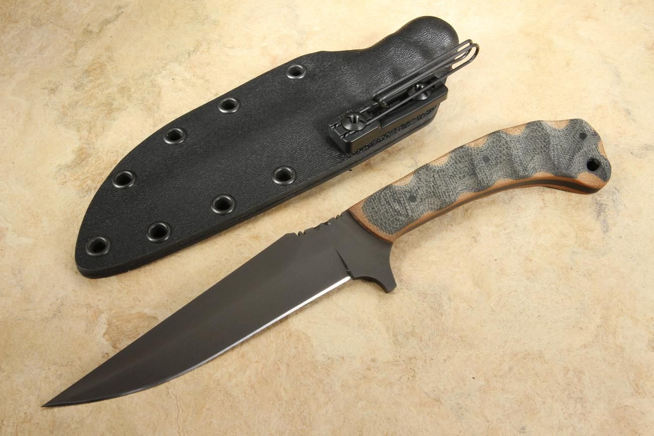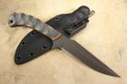 The sculpted wasp laminate Shadow Strike features one of the most distinctive handle materials in the Winkler lineup. Wasp is a black and tan layered canvas laminate with fibers that add strength and impact resistance, and the alternating color pattern gives each handle a unique visual character - no two are exactly alike. The hand-sculpted contours carved at the Winkler shop add aggressive grip texture on top of a material that already provides natural traction in wet and humid conditions. Wasp laminate holds up to hard use without showing wear the way wood can.